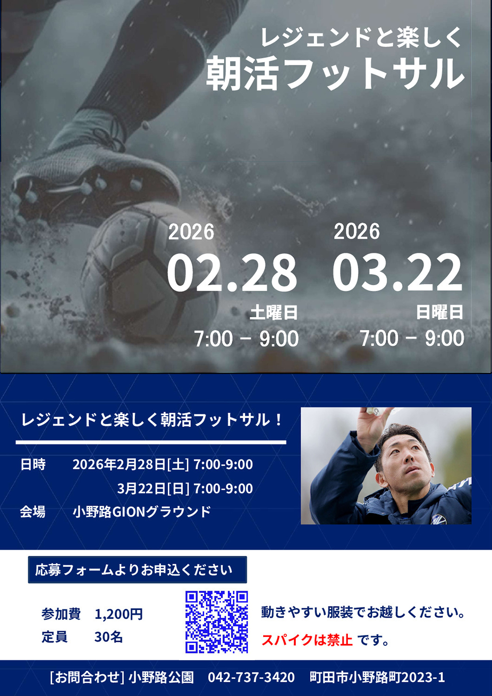 日頃より小野路公園をご利用いただきまして誠にありがとうございます。 2/28(土)・3/22(土) レジェンドと楽しく朝活フットサルを開催いたします。 詳しくは下記イベントページよりご確認ください。