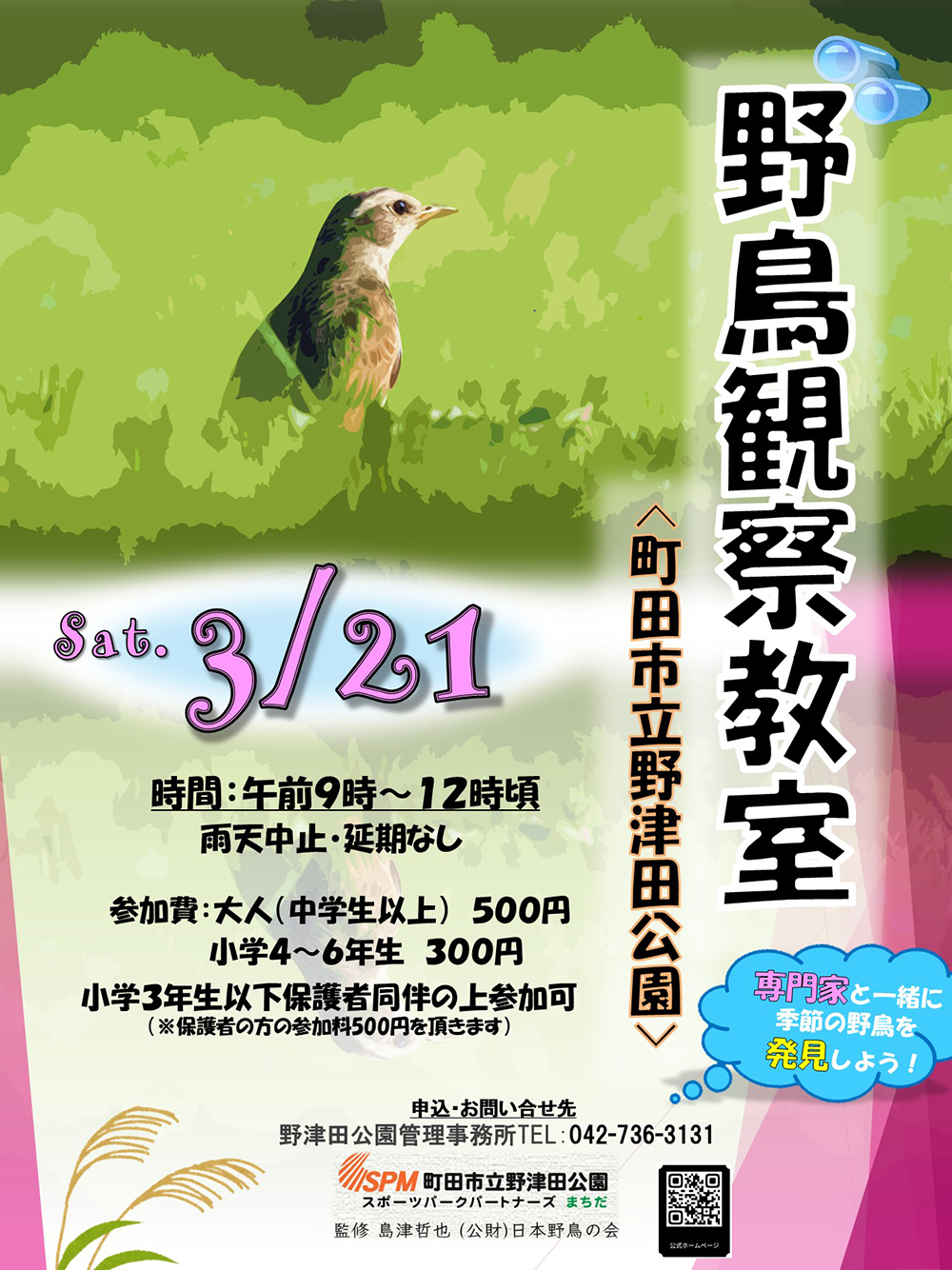 専門家を招いての野鳥教室を開催いたします! 野津田公園に生息する野鳥たちを一緒に観察しませんか? 皆さまの参加をぜひお待ちしております。 受け付け方法はお電話で受け付けております。 詳細に関しましてはお気軽に野津田公園管理事務所までご連絡ください。